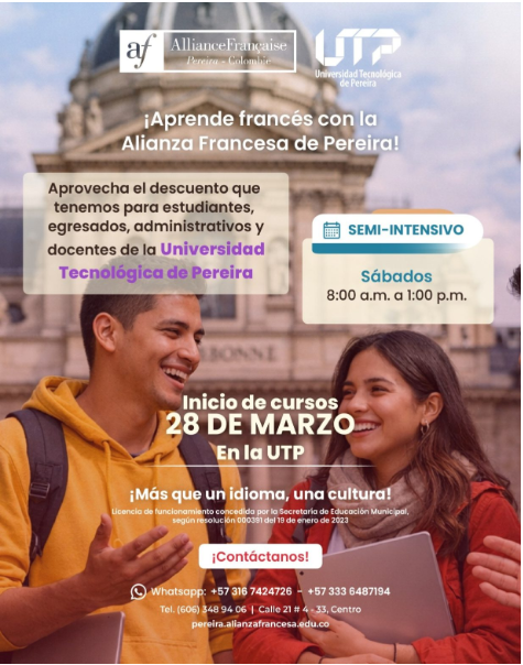 La Oficina de Relaciones Internacionales (ORI) invita a la comunidad universitaria a aprovechar la oportunidad de aprender francés en alianza con la Alianza Francesa de Pereira, una institución reconocida internacionalmente por la enseñanza de este idioma y la promoción de la cultura francófona.